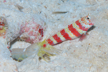 ヒメダテハゼやミナミダテハゼに比べれば、なかなか赤帯が鮮やかで派手なのだけど、海中では赤色が真っ先に吸収されるため、残念ながらこの模様が黒っぽく見えてしまう。
