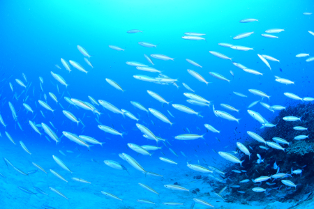 白い砂地の海を群れ泳ぐクマザサハナムロは、基本的に青っぽい色をしている。