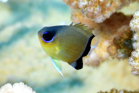 帰国後に図鑑「日本の海水魚」を見てみると、このスズメダイが普通に載っているではないか。