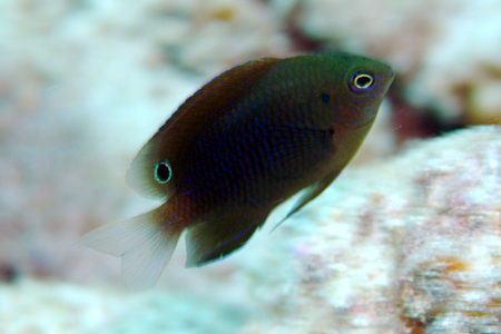 幼魚から若魚にかけての眼状斑といい、オトナの色味といい、他に似たようなものがワラワラいるなか、コイツをミナミイソスズメダイだと認定している決め手は、眼の後方にチョンとある小さな黒点。