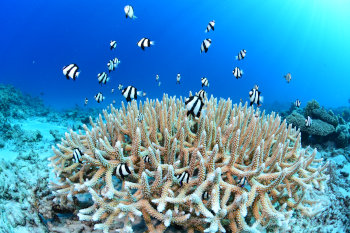 ビーチの中などの小さなサンゴにも、小さなミスジリュウキュウスズメダイが集まる。