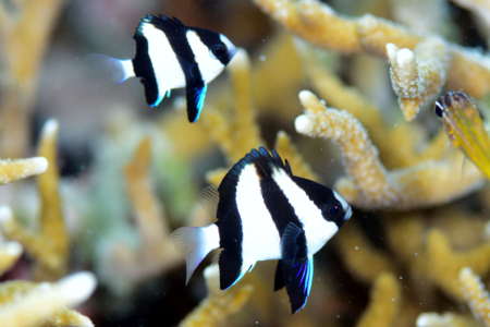 海中で観るほうがよりクッキリ目立つこの若ミスジの蛍光ブルーの存在感は、白と黒の魚というミスジリュウキュウスズメダイのイメージを根底から覆す…