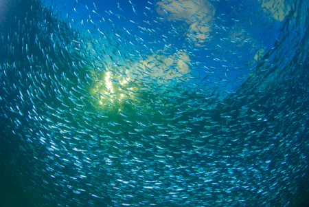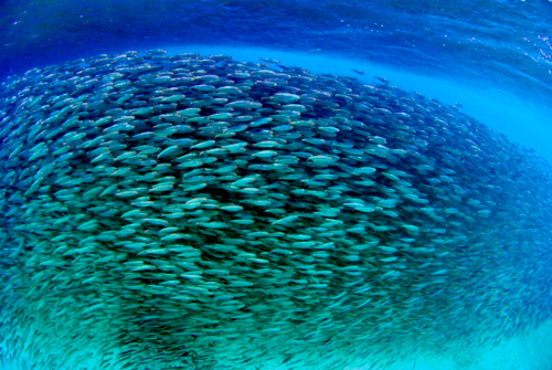 早めにダイビングの準備を終えたゲストのなかには、ドボンとこの魚群に飛び込んで、「群れ」を楽しむ方々も多い。