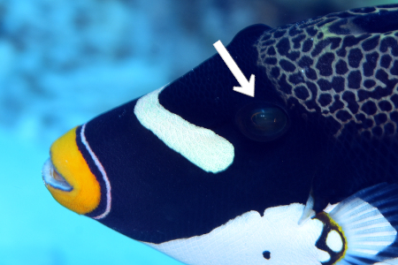 でも実際の目は、その黄色いラインよりも背ビレに近い側にある(下の写真の矢印の先)。