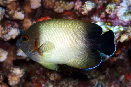 時としてスズメダイに間違えられることもあるこのような小さなヤッコは、アブラヤッコ属という仲間だ。