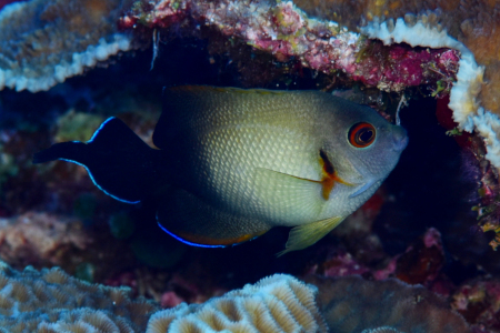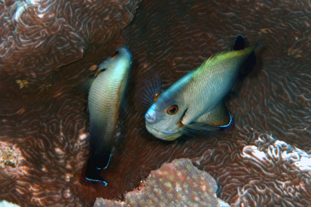 そのためか、魚の観察が好きな方でも、案外この系統の小さなヤッコをご存知ではないことがあり、かつてログ付けの時に、こんな模様のスズメダイを見たんだけどあれは何スズメダイだ?と問われ、実はこれら小さなヤッコ類のどれかであった、ということもあった。