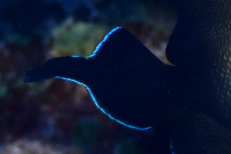 画像だと動かないから一見なんの変哲もないナメラヤッコに見えるかもしれないけれど、動いている様子を観ていたら一目瞭然、このナメラヤッコ、尾ビレが変なんです。