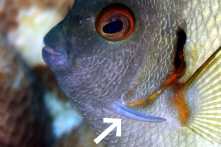 キンチャクダイの仲間のエラ蓋には、スズメダイには無い鋭いトゲが1本ある(矢印の先)。