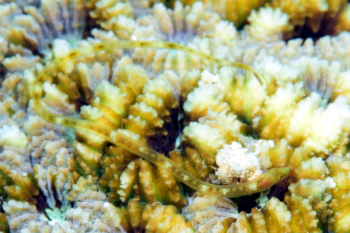この細長い体、尾ビレの感じ、そしてサンゴの上を這う姿は、どこからどう見てもヨウジウオの仲間だ。