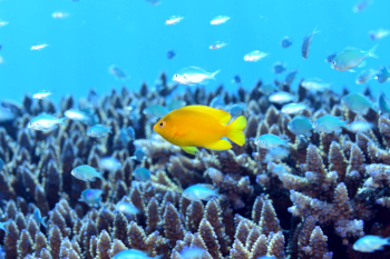 ミドリイシ類をはじめとするサンゴに、鮮やかなイエローの小魚がチラホラする様子はとても映える。