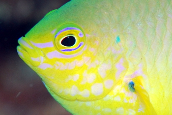 体の色はナガサキスズメダイのように劇的に変化してしまうわけではなく、眼状斑が無くなる頃には、黄色味が薄くなっている程度だ。