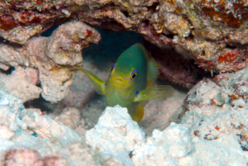 幼魚たちはけっして群れ集うわけではないけれど、そこかしこでチラリホラリとこのレモンイエローが見え隠れする様子は、そばに必ずといっていいほどいるナガサキスズメダイのブルーとあいまって、箱庭的ささやかな美しさがある。