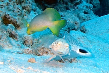 そっくりなネッタイスズメダイに比べるとオトナのサイズは2周り以上大きく、ホンソメワケベラと並ぶとこんな感じ。