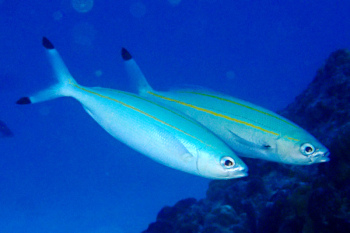 タカサゴもニセタカサゴも、淡いブルーに黄色い線というボディの配色は同じながら、タカサゴの上から2番目の黄色い線は、側線とズレている。
