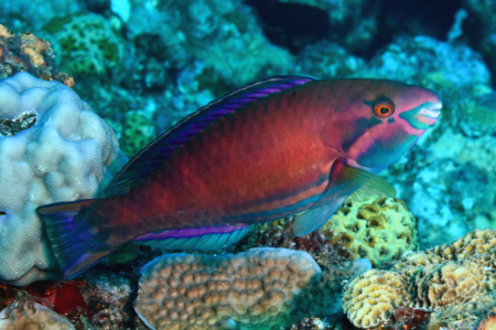 いやはや、紫色のラインがエキゾチックな、やたらと派手な色彩が際立つブダイちゃん、はてさて、何ブダイだろう??