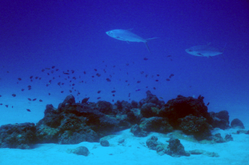 水深20mくらいのところでふと水面付近を見上げると、サメに似ていなくもない戦闘的なフォルムの大きな魚が4〜5匹悠然と泳いでいることがある。