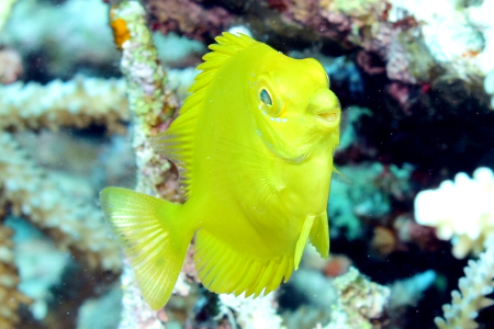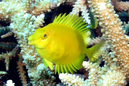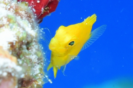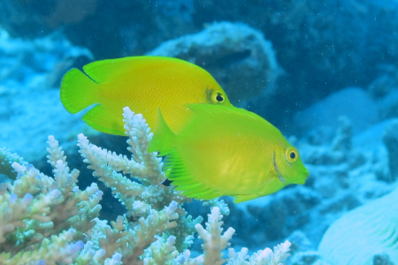 3cmほどの小さな黄色い魚が目の端でウロチョロしていたときにはネッタイスズメダイかと誤解していたんだけど、なんかネッタイスズメダイの動きじゃないっぽい…と注視してみたらば、それはまさかのイエローラビットちゃん。