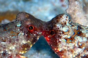 他の魚の稿でも何度も触れているように、水深が増せば増すほど赤色が吸収されてしまう水中では、20m超の水深になると赤色は、黒っぽく見えて目立たなくなる。