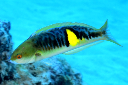 ところで、体の中央に黄色い模様があるおかげで「シラタキベラ」だとハッキリわかるのはオトナのオスで(他の多くのベラ同様雌性先熟なので、メスの中の力のあるものが「オス」になる)、メスはそうと知らない限りほとんど目に留まることがない。
