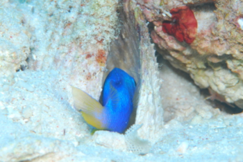 ルリスズメダイの稿でも触れているとおり、ルリ…がインリーフの浅いところに住んでいるのに対し、ソラスズメダイはリーフの外におり、リーフ際の転石が多数転がっているような浅いところで、目にも鮮やかな青い集団を作っている。