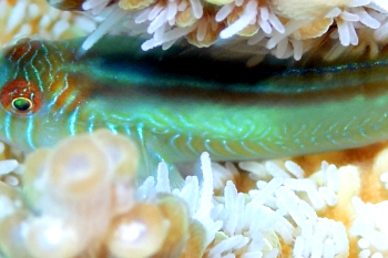 ……と思っているうちにただ月日だけが流れていたところ、この期に及んで(?)コバンハゼ類サーチをしていた2020年11月に、元気いっぱいに成育中のテーブル状のミドリイシ類の枝間で↓こんなハゼと出会った。