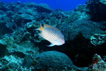 雌性先熟の性転換をするタテジマヤッコの仲間は、チビの頃はメスとほぼ同じ色模様をしているのだけれど、体に比した目の割合が大きいからカワイイ。
