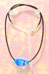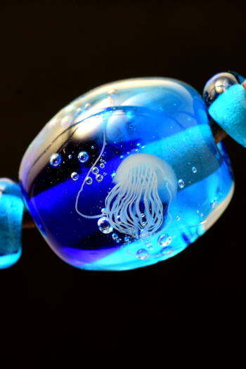 海色の青い玉にポッカリとくらげが浮かぶとんぼ玉のネックレスです。くらげは絵ではなく、立体的にガラスで造形されており、ひとつひとつ手作りなのでくらげの姿はそれぞれ違います。
