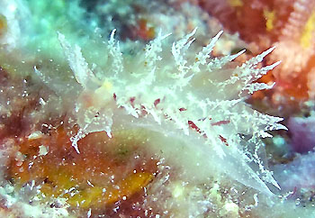 周りの岩肌からホジャララと生えている海藻類とそっくりなので、よほどウミウシを求めて目を皿のようにしていないかぎり素通りしてしまうことだろう。