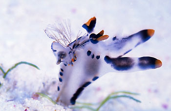 砂底にポツポツ生えている(動物だけど)クマデコケムシを好物にしているため、そのクマデコケムシを目印にすると、梅雨時から初夏の頃ならけっこうな確率で見つけることができるウミウシ。