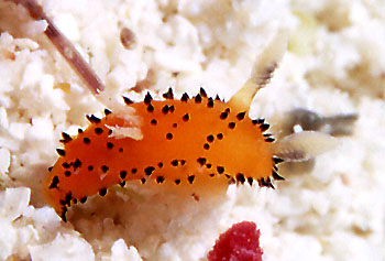 左の肌色部分はうちの奥さんの指。 こんな小さなウミウシの鰓や触角の色だなんて、肉眼で確認するのはほぼ不可能。