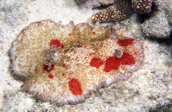 よく似たウミウシにホンカワウミウシというのがいて、写真をパッと見ていったいどこがどう違うのかよくわからなかった。 でもよくよく観てみると、表面にゴッホの筆使いのような細い線がビッシリ入っている。それがユウゼンウミウシの特徴であるらしい。