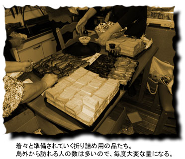 水納島では法事の際、出席者に折り詰めを渡すのだけれど、その中身は伝統的にほぼ統一されており、三枚肉の煮物(豚の角煮)、秋刀魚の揚げ物、島産の魚の揚げ物、たこの刺身、かまぼこ、ドーナツのような揚げ菓子、まる餅(米の粉で作った平たくて丸い餅)、揚げ豆腐、結び昆布、といったあたりが定番で、それにプラスアルファがつくこともある。