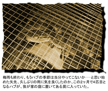 その後、行政の協力を得て確保された小型のタッパに毛が生えた程度のハブ罠が、我が家を含めて島内各所にいくつか設置されたところ、もののひと月ほどの間に次々とハブが捕獲された。